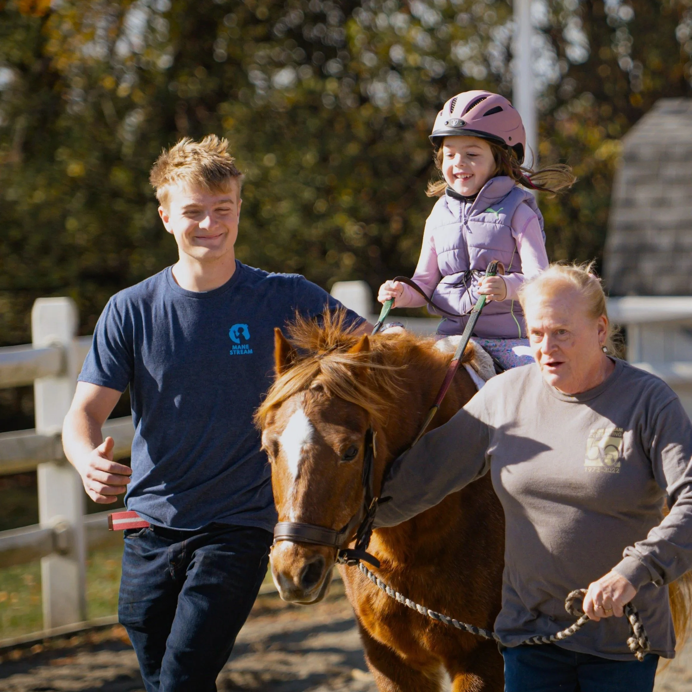Adaptive riding lessons use adaptive teaching techniques and/or equipment to help riders learn riding and horsemanship skills through instruction from a PATH Intl. Certified Instructor and assisted by volunteers to lead the horse or walk along with the rider when necessary.